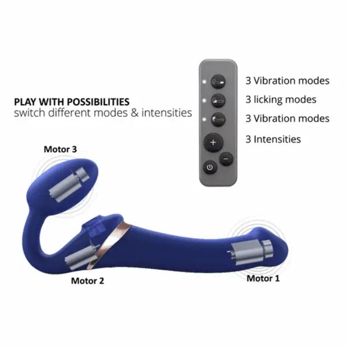 The unique Multi-Orgasm bendable strapless strap-on offers two-in-one clitoral and G-spot stimulation for the wearer, and powerful shaft vibration for their partner. Each motor delivers three functions with three intensities, controlled independently with the included remote control. Its completely flexible design ensures a comfortable fit and allows you to get the right angle every time.